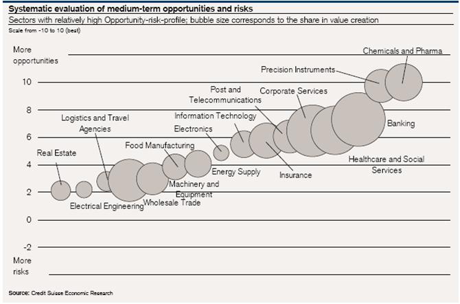 This is an interesting example of a pictogram or scatter chart to represent two variables: 1) level of opportunity/risk (vertical scale) and 2) size of share value (size of bubbles).