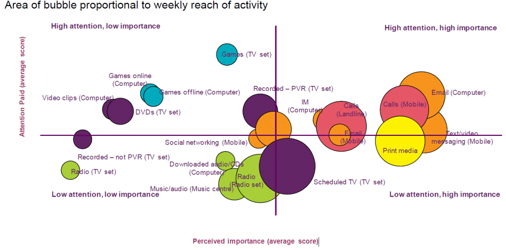 Interestingly, social media (mobile) sits in the middle and TV gaming  (e.g. Playstation, nintendo, Xbox) gets high attention but is of low importance (witness any teenager “glued” to these games and you know the score…).