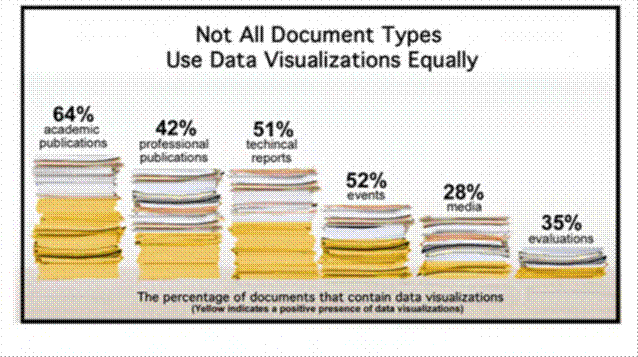 If you are interested in how evaluation results are presented as I am, then you might be interested in this fact sheet (pdf) from IDRC on data visualization for communicating research and evaluation findings. It contains some fascinating information on how data visualization can be used (and misused). As can be seen in the chart below it shows that evaluation reports are on the low end in terms of their usage of data visualization.